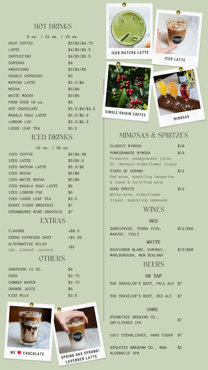 Welcome to Odysea Coffee, a delightful coffee haven located at 265 Lake St, Bristol, NH. This cozy spot boasts a carefully curated menu, featuring a range of impressive coffee options that cater to every palate. Enjoy choices like the Double Espresso and Iced Latte, with customization options for those who love a personal touch. Each drink is brewed to perfection, offering a strong yet smooth experience that coffee enthusiasts will surely appreciate.